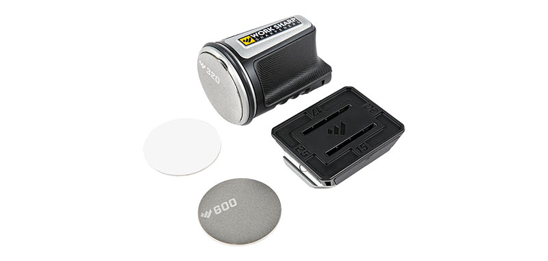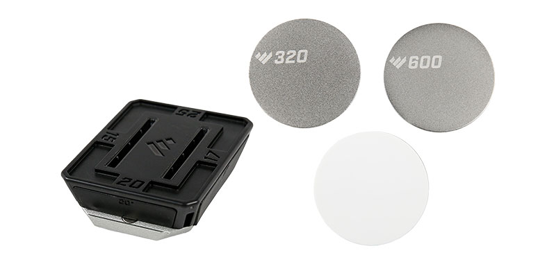 Affûteur vendu avec 3 disques abrasifs (diamand fin 600, diamand grossier 320 et céramique fine).